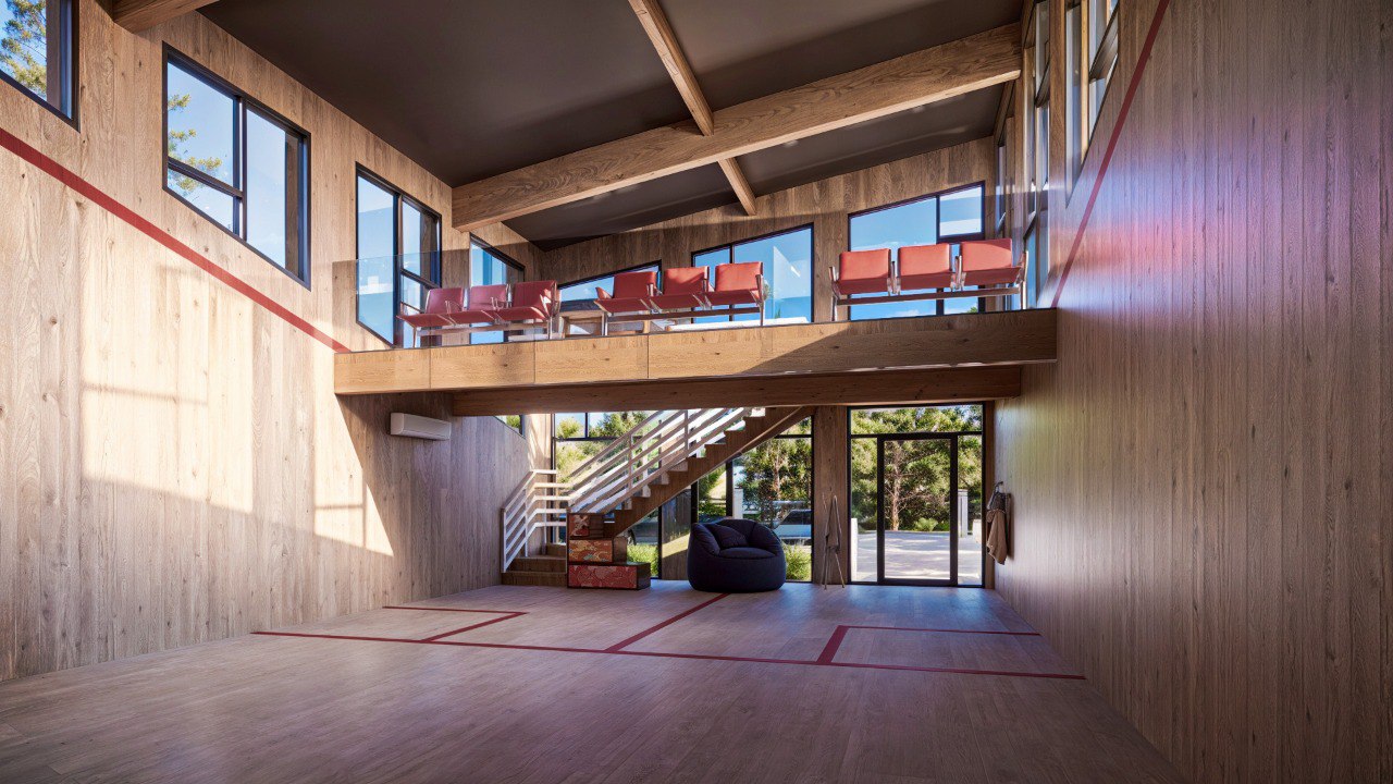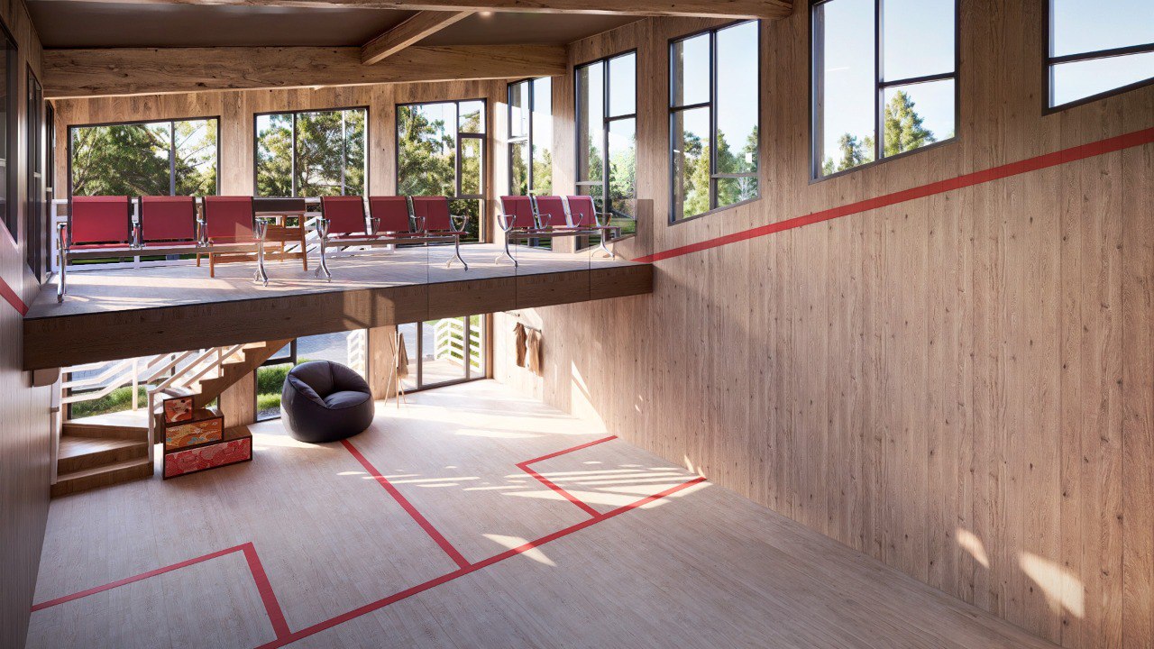 SPORTBOX — это модульный мини-спортцентр из CLT и клеёного бруса, полностью готовый под сквош.